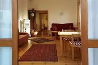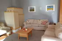 1. Das Gästehaus hat 4 Wohneinheiten mit Wohnzimmer, Duschbad und 1 – 3 Schlafzimmern; Babybetten sind zusätzlich möglich. Für alle gibt es im Erdgeschoss eine Gemeinschaftsküche, ein Esszimmer für bis zu 24 Personen und ein Wohnzimmer mit Kachelofen, Büchern und Billard (90 m²). Die Einrichtung ist hochwertig mit geölten Massivholzmöbeln auf Dielenböden mit Ökofarben an den Wänden. Zum Haus gehören das überdachte, halb offene Gartenzimmer mit Außentoilette und Grill, eine Sandkiste und ein Kaninchenauslauf für die Kinder.