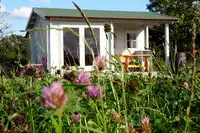 2. Das Permakulturhaus ist ein Gruppenhaus aus Lärche mit Ofenheizung. Übernachtungen sind nur im Sommerhalbjahr möglich in zwei Schlafzimmern mit Doppelbett (einmal mit zusätzlichem Kinderbett, weitere Babybetten sind möglich). Das 3-er Zimmer hat ein eigenes Duschbad, das andere nutzt eines der 3 Duschbänder auf dem Flur. Die Wirtschaftsküche mit Herd und Spülmaschine grenzt mit Durchreiche an die Bauernhofhalle mit Bullerjan-Ofen (90 m²). Davor liegen eine große eigene Südterrasse mit Grill, Sandspielplatz und Kaninchenauslauf.