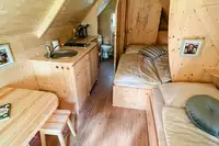 16/19 Eifelhüttchen von innen mit Bad, Kochzeile, Sitzecke und Betten für bis zu 4 Personen