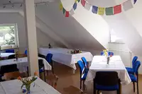 Zimmer: Tlw.mit Waschbecken, sep. Waschraum, Duschen, WC, Aufenthaltsraum und Selbstkocherküche, 200m2 Zeltplatz. 12 Betten, Lagerplatz für 10 Pers.Freizeit