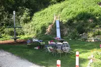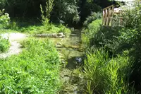 Der Außenbereich verfügt über 118 Plätze (50 davon sind bevorzugt für Hausgäste), einen Spielplatz , einen zu verleihenden Schwenkgrill für die Grillstelle, einen Parkplatz und den renaturierten Riedbach mit Spielbereichen und Quellen, jenseits davon ist ein kleiner Zeltplatz.