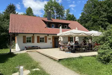 Der Außenbereich verfügt über 118 Plätze (50 davon sind bevorzugt für Hausgäste), einen Spielplatz , einen zu verleihenden Schwenkgrill für die Grillstelle, einen Parkplatz und den renaturierten Riedbach mit Spielbereichen und Quellen, jenseits davon ist ein kleiner Zeltplatz.