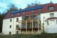 Das Übernachtungs-Haus bietet Platz für 37 Personen in 8 Mehrbett- und 2 Betreuerzimmern. In jeder Etage finden sich Duschen und Toiletten, die teilweise behindertengerecht ausgestattet sind. Im Erdgeschoss liegt die große Selbstversorgerküche, ein Aufenthaltsraum mit Terrasse zum See, ein gemütliches Kaminzimmer mit Wintergarten; außerdem 2 Arbeitsräume, eine Teeküche und eine Bibliothek.Unser nachhaltiges Seminarzentrum bietet Ihnen zusätzlich 2 Seminarräume mit modernster Technik.