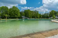Die Idee von dem Bad mit Campingplatz finde ich als geniale Idee.Ich war Neugierig, was wurde aus dem Freibad nach dem Umbau..Viel Geld wurde investiert,aber ohne den Erfahrungsbericht von Fachpersonal einzuholen..Das Bad wurde als Ökobad ausgelegt..dann gibt es eine Besucherzahl Begrenzung,was ich so nicht festellen konnte..Die Kasserin war sehr unfreundlich und brasch auf meine Frage,ob ich es mir mal ansehen darf, nach 35 Jahren..zum Technischen Teil..das Becken hat leider keine bis schlechte Durchströmung,denn die Algenbildung im vorderen Teil das Beckens(Totwinkel)...wie kann man einen Sandkasten, unmittelbar zum Schwimmbecken installieren,was eine zusätzliche verschmutzung bedeutet..als der Schwimm-Meister mit dem Unterwassereiniger, versuchte das Becken zu reinigen,habe ich den Kopf geschüttelt..so ein Gerät funktioniert vielleicht in einer Halle,aber nicht in einem Naturbecken...vielleich sollte doch wieder zur Chlorung übergegangen werden,um das Wasserproblem zu beseitigen..oder das Becken mit besserer Durchströmung umbauen..