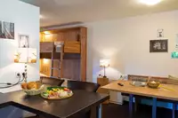 Ein gemütliches Schlafzimmer mit Doppelbett und ein Wohnbereich mit Stockbett sorgen für ausreichend Schlafmöglichkeiten. In der gut ausgestatteten Küche können gemeinsame Mahlzeiten zubereitet werden. Das Badezimmer ist mit einer Badewanne ausgestattet und rundet den Komfort der Wohnung ab. Ein besonderes Highlight ist der Garten, der zum Verweilen und Entspannen einlädt und Ihnen einen Moment der Ruhe inmitten der Natur bietet.