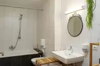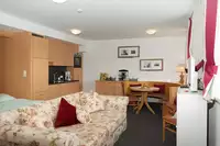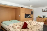 Sie verfügt über ein komfortables Doppelbett und eine gut ausgestattete Küche, die für Selbstversorger bestens geeignet ist. Ein eigenes Badezimmer mit Dusche und WC sorgt für zusätzlichen Komfort. Das Besondere an dieser Wohnung ist der direkte Zugang zum Garten, in dem Sie im Sommer ein erfrischendes Getränk genießen oder sich im Winter bei einem heißen Tee entspannen können.
