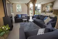 Im Haupthaus: Gemütliche Sitzecke mit Holzofen, große Esstische und komplett eingerichtete Küchen, Bäder mit Du/WC und Badewanne, 2 EZ sowie 5 2-BZ, Sauna, Terrasse und schön angelegter Garten (max. 12 Pers.).
