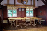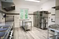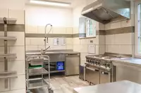 Erdgeschoss: großer Aufenthaltsraum für ca. 80 Personen, kleiner Aufenthaltsraum für ca. 15 Personen, Vorraum mit Sitzmöglichkeiten für ca. 12 Personen, Küche mit Elektroherd, Dunstabzug, zwei Kühlschranken (einer davon mit 3 Gefrierschüben), Industriespülmaschine - Keller: Damen und Herren-Toiletten, Kicker, kleiner Billardtisch