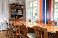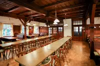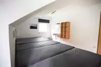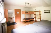 Bitte prüft vor Anfrage unseren Belegungskalender auf der Webseite.Obergeschoss: 7 Schlafräume mit 37 Betten und eigenem Waschbecken - davon zwei Leiterzimmer mit jeweils eigener Dusche, zwei weitere Duschen und zwei separate Toiletten