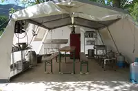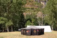 Unser Zeltplatz liegt direkt am Tarn und bietet viel Raum für ein Lager inmitten der Schlucht. Zwischen Pappeln und Obstbäumen findet ihr schattige Bereiche für eure Schlafzelte, dazu offene Flächen für Aktivitäten und das Lagerleben. Die Lage am Fluss prägt den Charakter des Platzes und macht viele Unternehmungen direkt vom Lager aus möglich.Ein eingerichtetes Küchenzelt in der Größe eines SG20 steht zur Verfügung. Es ist mit zwei Hockerkochern, einem Gasbräter, einer Spüle, zwei Kühlschränken, einem Gefrierfach sowie Kochgeschirr/Töpfen ausgestattet. Strom und Beleuchtung sind vorhanden.