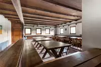 Gekocht wird in der rustikalen Küche, Platz zum Essen und Beisammensein gibt es im Tagungs-/Aufenthaltsraum mit Tischen, Bänken, Stühlen und einem Kachelofen. Die sanitären Anlagen (Plumpsklos) sind einfach.