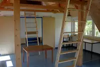 Im Obergeschoss gibt es einen etwa 50m² großen Aufenthaltsraum, der sich auch gut als Schlafraum nutzen läßt. Im Erdgeschoss des Hauses befinden sich zwei weitere Aufenthaltsräume, eine kleine Küche mit Kühlschrank, Herd, Ofen und Spüle (Geschirr und Töpfe für 30 Personen). Weiterhin gibt es zwei Toiletten, einen Waschraum mit zwei Duschen und einen behindertengerechten Waschraum mit Dusche und Toilette.Das gesamte Gelände umfasst etwa 1600m² Wiesenfläche. Es besteht die Möglichkeit zu Zelten und eine eingefasste Lagerfeuerstelle ist vorhanden.