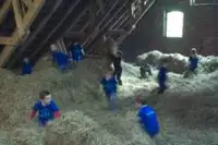 Übernachtungen im Heu. Ein freundlich dekorierter Gästeraum im ehemaligen Stallgebäude bietet Platz für 100 Personen.Freizeit