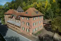 Gruppenhaus in der ehem. Fürstlich Leiningenschen Poststation. Der Gastraum, die Nebenräume werden als Essen- und Aufenthaltsbereich genutzt. Die Lounge lädt mit TV, Tischkicker und Dartscheibe zum gemütlichen Beisammensein ein.Die Küche ist voll ausgestattet und ermöglicht das Kochen für große Gruppen. Im 1. OG sind die 8 Zimmer (3x2, 4x4, 1x6 Betten) alle mit DU/WC ausgestattet.
