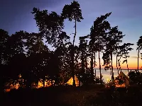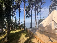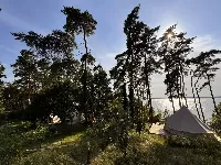 Direkt am Achterwasser auf der Halbinsel Gnitz (Insel Usedom) mitten im Naturpark. Auf dem Naturcamping Usedom neben unserer Red Woods Wassersportschule an der Küste mit Blick über die Krumminer Wiek nach Westen.Zinnowitz (HBF, Ostsee und Geschäfte) ca. 7 km entfernt. Mit dem Fahrrad ca. 15-20 min.