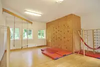Turnraum mit Geräten, Matten und Kletterwand, (auch als Entspannungsraum nutzbar mit Kaminofen und entsprechender Entspannungsmusik, CD's und Player können bei uns ausgeliehen werden!)