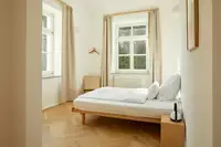 Das Haus verfügt über bis zu 32 Betten, die sich auf 12 Zimmer mit jeweils eigenem Bad verteilen. In allen Schlafräumen befindet sich 1 Doppelbett, wobei die größeren Zimmer bei Bedarf um ein oder zwei Betten erweitert werden können.