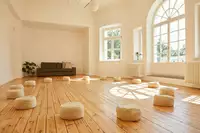 WLAN, Videobeamer, Musikanlage (Bluetooth), Flipchart, Pinnwände, Yoga-Matten und Kissen