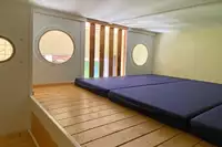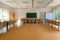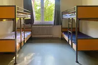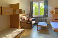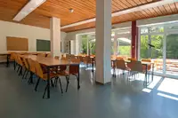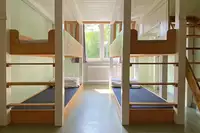 Unser Haus bietet Platz für zwei Gruppen mit 41 und 44 Betten auf getrennten Etagen. Jede Etage hat 5 Mehrbettzimmer (4–8 Betten) und 2 Betreuerzimmer (1–4 Betten) mit eigener Dusche und Waschbecken. Je Etage sind zwei Dusch- und Toilettenräume vorhanden. Zwei große Aufenthalts- und Speiseräum mit Terrasse stehen den Gruppen zur Verfügung. Für Gruppenleitungen gibt es außerdem einen eigenen Aufenthaltsraum mit Kaffeemaschine, Wasserkocher und Kühlschrank. Im Dachgeschoss befindet sich eine große Sofalandschaft und ein Freizeitraum mit Tischtennisplatte und Kicker. Zur weiteren Ausstattung gehören Spiele für drinnen und draußen, unsere „Team-Time-Kiste“, ein Beamer mit Leinwand sowie Flipcharts und Whiteboards. Für nasse Kleidung oder Ausrüstung steht ein Trockenraum bereit. WLAN ist vorhanden.Das Gelände