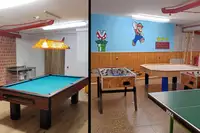 Billard, Airhockey, Tischtennis, Kicker, Spiel- und Sportgeräten, wie „Tower of Power“ von Metalog (Videos auf You tube) für Teamtraining und sehr viele Gesellschaftsspiele für einen Spiele-Wettbewerb,Hart- u. Beachvolleyballplatz, Fußballplatz, Hängemattenpark, Rutsche, Bodentrampolin, Lagerfeuerplatz und verschiedene Spielgeräte.