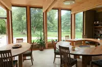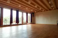 Das gesamte Haus ist mit Naturbaustoffen neu errichtet. Lehmputz in den Gästezimmern, Aufenthalts- und Seminarräumen lassen ein natürliches Raumklima erfahren. Holz - und Schieferböden runden das Ganze ab.Im 1. OG befinden sich, ein großer Seminarraum (120 m²) mit Holzdielenboden und Terrasse, sowie ein kleiner Seminarraum (20 m²).