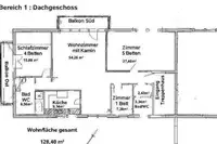 10 Betten, Küche, 2 Bäder, großer Gemeinschaftsraum ca 50 m² mit Kamin + Balkonen im Dachgeschoss
