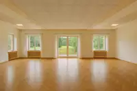 Der 90 m² große Seminarraum im ersten Stock des Hauses bietet viel Tageslicht und einen herrlichen Blick auf die umliegenden Wiesen und den Wald. Eine angrenzende 60 m² große Terrasse erweitert den Raum nach außen. Der Raum ist vielseitig nutzbar und eignet sich sowohl für konzentriertes Arbeiten als auch für Bewegung und Entspannung.Ausstattung: