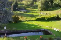 Der große Garten ist ein Rückzugsort im Grünen mit altem Baumbestand, einem plätschernden Bachlauf und einem quellgespeisten Naturteich. Sonnige Bänke und weite Wiesen laden zum Innehalten und Durchatmen ein.Naturteich
