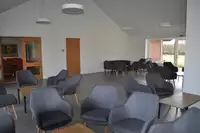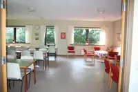 Im Gruppenhaus gibt es einen Aufenthaltsraum, der auch als Speisesaal genutzt wird und einen Flur mit Sitzgelegenheiten und Kicker und einen weiteren Vorraum mit Tischtennis.