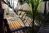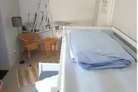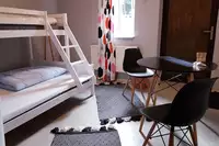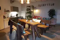 Erdgeschoss, eigener Innenhof mit Sitzmöglichkeiten, voll ausgestattete Selbstversorgerküche, kleiner Grill vorhanden. Essbereich im Innenbereich, Aufenthaltsbereich mit Sofa,Ein 10-Bett-Zimmer, ein 6-Bett-Zimmer, jeweils mit Etagenbetten. 3 Privatzimmer mit variablen Betten (Doppel, Zweier, Einzel oder Dreier), eines dieser Zimmer mit eigenem Bad. In den Gemeinschaftsbädern jeweils 2 WCs, 2 Duschen, 2 Waschbecken