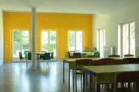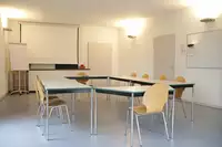Der Speisesaal bietet genug Platz für alle, ist hell, sonnig, mit Terrasse und Garten für warme Tage. Im Haus gibt es keine extra Seminarräume. Ihr könnt die Tische im Speisesaal verrücken - dann kann es losgehen. Natürlich gibt es WLAN im Haus, eine Leinwand, ein Whiteboard, ein Flipchart und Moderationswände. Zusätzlich kann ein Beamer und Moderationsmaterial gegen Gebühr ausgeliehen werden.Bitte beachtet dabei aber, dass der Speiseraum ausschließlich dann als Seminarraum genutzt werden kann, wenn die Gruppe den Hauspreis bezahlt. Am Anreisetag steht dieser ab 14.00 Uhr zur Verfügung, am Abreisetag bis 10.00 Uhr. Soll der Speiseraum am An- und/ oder Abreisetag länger genutzt werden, ist der halbe Hauspreis je Tag zu entrichten.
