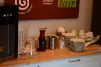 Wasserspender mit gekühltem Wasser (still oder spritzig) rund um die Uhr kostenfrei zugänglich.