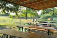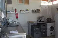 Es gibt ein gut ausgestattetes Küchenhaus mit großem, überdachtem Essplatz für bis zu 60 Personen. Ausreichend Pfannen, Töpfe und Geschirr. Gastfreundschaft wird in Griechenland groß geschrieben: ein Begrüßungs-Barbecue für jede Gruppe ist im Preis inklusive!Wer kein Kochteam hat, kann sich für € 7,00 vor Ort ein Tagesgericht zubereiten lassen. Einfache, frische, regionale Produkte. Auch einfache Vollpension möglich. Getränke können in Kommission abgenommen werden oder werden selbst gekauft. Eine eigene Süßwasserquelle auf dem Gelände mit Bergquellwasser vom Olymp erlaubt auch eine preiswerte Versorgung mit Getränken (laborgeprüfte Trinkwasserqualität).