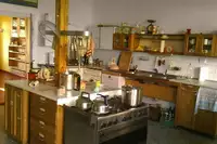 Unsere einfachen und preisgünstigen Räume können ganzjährig Gruppen bis zu 12 Personen beherbergen. Auch für größere Gruppen, die unsere Gästeetage, den Saal und das Gelände nutzen möchten, findet sich in der Regel eine Möglichkeit. Die gesamte Gästeetage ist berollbar und zentral beheizt. Es gibt 5 Schlafräume mit je 2 - 5 Betten, einen Gemeinschaftsraum und eine große, gut ausgerüstete Selbstversorger-Küche. Auf den Wiesen hinter dem Haus kann gezeltet werden.Technik: Fernseher mit Video-/DVD-Player, eigener Telefonanschluss und Internetzugang (WLAN) sind vorhanden. Nach rechtzeitiger Anfrage können wir auch Beamer, Musikanlage, Stellwände und andere technische Ausstattung anbieten.