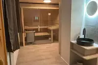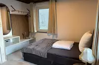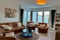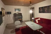 Im Untergeschoss befindet sich die große, voll ausgestattete Küche – perfekt für Gruppen, die gerne gemeinsam kochen. Das angrenzende Esszimmer bietet mit seinen langen Tischen und der Sitzbank ausreichend Platz für ausgedehnte Mahlzeiten. Ein besonderes Highlight ist das Klavierzimmer, das neben dem TV-Bereich zum Musizieren und Entspannen einlädt.Das Obergeschoss bietet vier Schlafzimmer mit hochwertigen Betten sowie ein modernes Badezimmer mit Doppelwaschbecken und Dusche. Das gemütliche Wohnzimmer mit Ledersofa, Sesseln und 55-Zoll-TV ist ideal für entspannte Abende im Kreis der Familie oder Freunde.