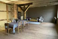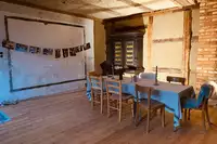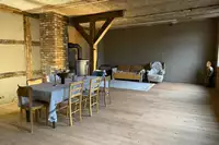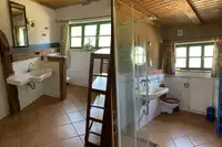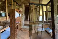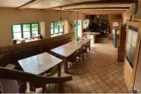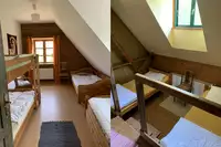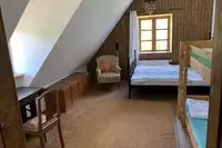 Betten gibt es für insgesamt 19 Personen (15 bei Einzelbelegung, 19 bei Doppelbelegung für 4 Betten): zwei Vierbett-Zimmer (Zimmer 1: ein Doppelbett & ein Etagenbett | Zimmer 2: zwei Einzelbetten & ein Etagenbett), ein Achtbett-Zimmer (vier Einzel- und zwei Doppelbetten, verteilt auf 3 Ebenen) und ein Dreibett-Zimmer in der unteren Etage mit einem Doppel- und einem Einzelbett.Am großen Esstisch in der Selbstversorger-Küche ist für alle bequem Platz zu den Mahlzeiten. Im Wohnzimmer verströmt der Lehmgrundofen behagliche Wärme. Mit zwei modernen Duschbädern und einer weiteren separaten Toilette Klo kommt morgens auch kein Stau auf.