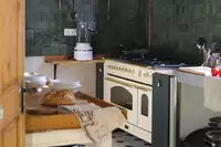 Küche: Vollausgestattete Küche mit Gasherd, Backofen, Konvektomat, Kühlschrank, Industriespülmaschine, Filter-Kaffeemaschine, Wasserkocher und Toaster