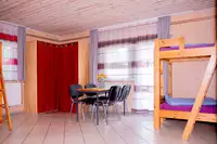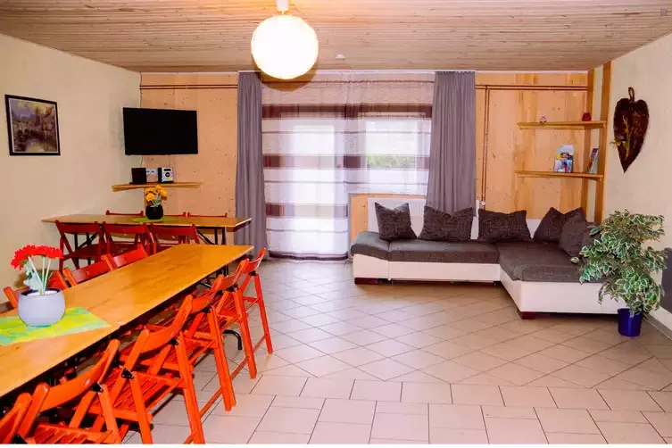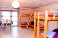 2 x 45 m² mit je 5 Etagenbetten ( DU/WC ) & einem Aufenthaltsraum mit SV-Küche sowie TV & Musik, überdachte Terrasse mit 2 Grillbars & Lagerfeuerplatz vor der Tür, ausreichend Parkplätze direkt am Haus.