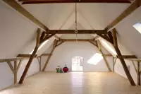 Auf 230 m² bietet die Yogascheune viel Platz für 10-12 Personen. Die Gruppenräume können bis zu 16 Personen genutzt werden. Weitere Schlafmöglichkeiten auf Anfrage.