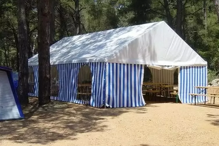Das Küchenzelt hat einen Kochbereich und einen Aufenthalt-/Essbereich mit Bierzeltgarnituren. Der Kochbereich ist komplett ausgestattet mit Gaskochern, Gasbrätern, Kühlschränken, Gefrierschrank, großen Töpfen, Geschirr und Besteck, Spülwannen …