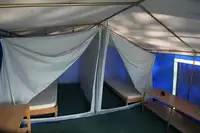 18 qm große Steilwandzelte, 2,30 m hoch, 2 Schlafkabinen (jede 4 qm), 2-4 Schlafplätze, Regale, 4 Stühe, 1 Tisch, Teppichboden, Licht,teilweise mit Kühlschrank und Steckdose...