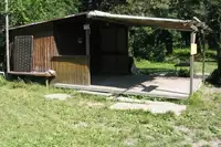 Auf dem Zeltplatz befindet sich eine Holzhütte mit Vordach. In unmittelbarer Nähe befindet sich eine Quelle, von der man sich mit Frischwasser (Kanister vorhanden) versorgen kann. Alternativ kann man auch im örtlichen Brunnen mit den Kanistern Wasser holen. In der Hütte selbst befinden sich ein Hockerkocher und zwei kleinere Gaskocher zudem Geschirr und Besteck.Drei Alex Rundzelte, Axt, Spaten und Schaufeln sind vorhanden, zusätzlich zu den vier vorhanden Garnituren gibt es fest installierte Tische und Sitzplätze für ca. 20 Personen.