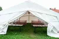 Unser großes Tageszelt bietet genug Platz um auch bei Regenwetter im Trockenen zu Essen, Spielen und Basteln. Locker gestellt passen hier 12 Biertischgarnituren hinein. Die LKW-Plane ist robust und durch die Fenster dringt viel Tageslicht. Bei gutem Wetter können die Seitenwände entfernt werden.
