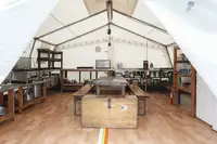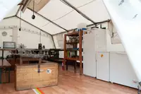 Das Materialzelt bietet genug Platz für mitgebrachtes Spiel- und Bastelmaterial. Drei Regale sorgen dabei für Ordnung. Durch das Deckenlicht kann hier auch noch spät Programm und Material für den nächsten Tag vorbereitet werden. Ein kleiner Kühlschrank bietet die Möglichkeit, Getränke oder verpackte Süßigkeiten gekühlt aufzubewahren. Eine Werkzeug-Basisaustattung, Planen und Decken stehen ebenfalls zur Verfügung.