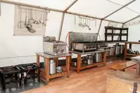 Das Küchenzelt ist mit allem notwendigen Equipment ausgestattet. Neben Kochstellen und Brätern sind auch die wichtigsten Küchengeräte vorhanden. Die Küche ist mit Koch- und Serviergeschirr für Gruppen bis zu 80 Personen, sowie mit Tisch-Geschirr für 20 Personen bestückt. Das Zelt hat einen festen Boden, viele Regale, große Edelstahl-Arbeitsflächen und die Möglichkeit die Vorder- und Rückseite an warmen Tagen auszuhängen, sowie ein Dachfenster zu öffnen. 2 Kühlschränke und 1 Gefriertruhe bieten auch genug gekühlten Stauraum für frische Lebensmittel.