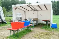 Der teilüberdachte Spülbereich bietet genug Platz zum Spülen von Koch- und Speisegeschirr. Der gesamte Bereich ist mit Lattenrosten ausgelegt um ein Vermatschen zu verhindern. Im Spülzelt können das Koch- und Serviergeschirr komfortabel in Spülbecken bzw. -wannen mit Ablauf gereinigt werden. Im Bereich davor stehen zum Reinigen des Tisch-Geschirrs Spülwannen für eine Spülstraße zur Verfügung. Zum Befüllen sind Schläuche mit Warm- und Kaltwasser installiert.
