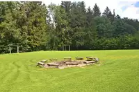 eine große Lagerfeuerstelle mit Holzsitzbänken