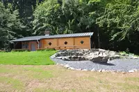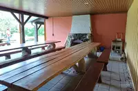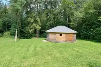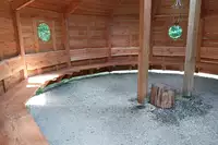 eine Blockhütte mit Aufenthaltsraum, Bänken und Tischen, offenem Kamin und Holzschiebetüren an der Vorderseite (komplette Öffnung möglich)einen Abstellraum mit Küchenspüle, Induktionskochplatten und Kühlschrank