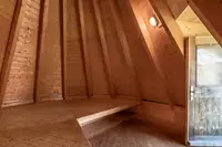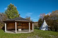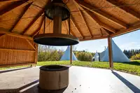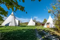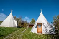 Fünf Holztipis mit Platz für je zehn Personen und einem Feuerhaus für gemütliche Abende.